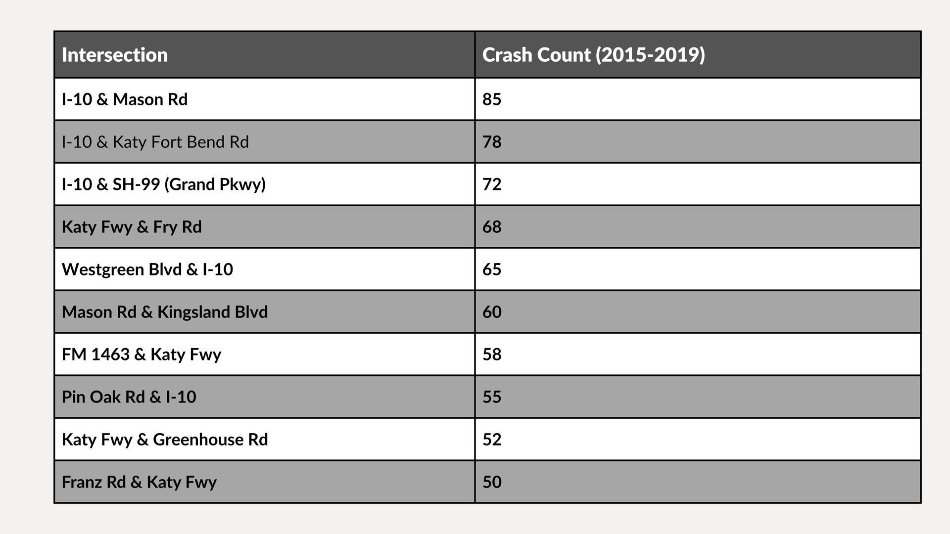 - Most Dangerous Intersection: I-10 & Mason Rd, with 85 crashes, driven by freeway access and retail traffic.