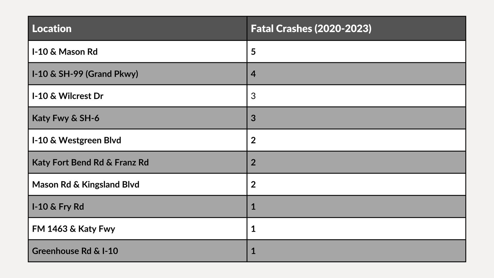 - Fatality Hotspots: I-10 & Mason Rd (5 fatal crashes).